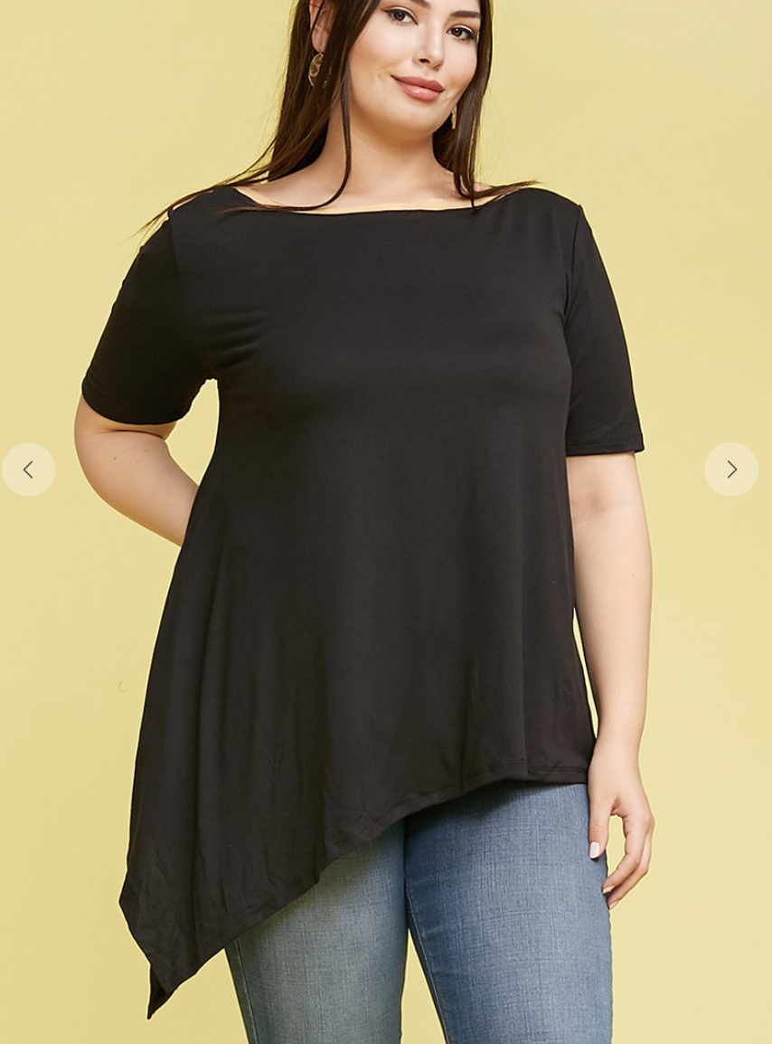 PLUS SIZE SHORT SLEEVE BOAT NECK ASYMMETRIC HEM TOP