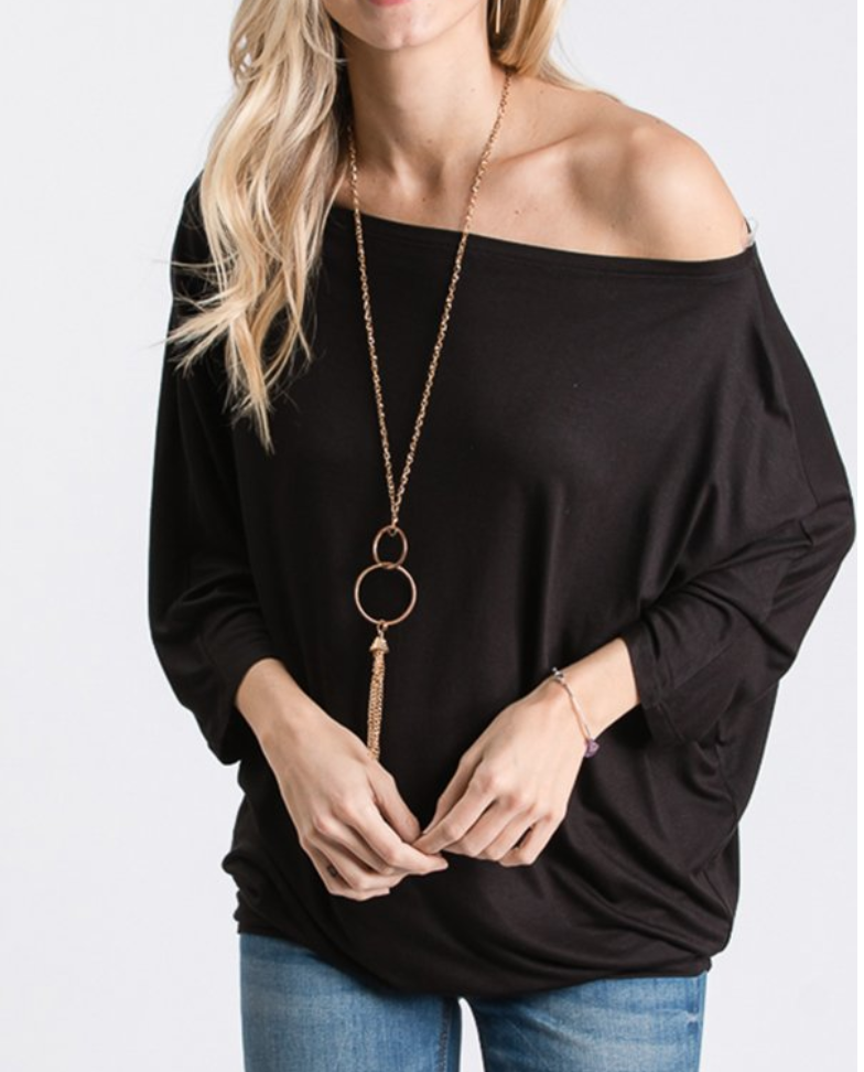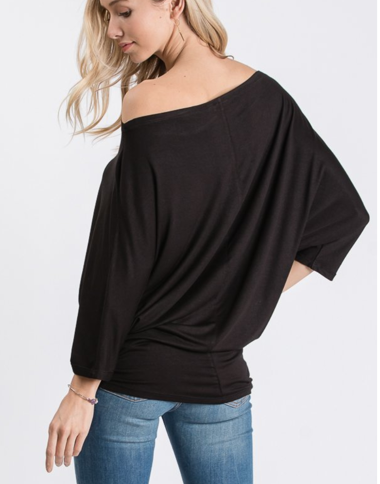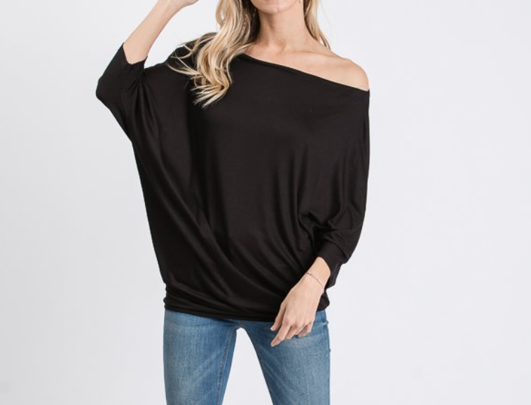 Holy yes! 3/4 sleeve Dolmon sleeve with amazing stretch. This black top is essential to any wardrobe. True to size on this comfy top.