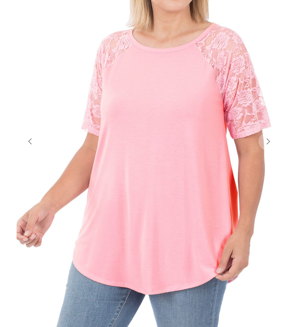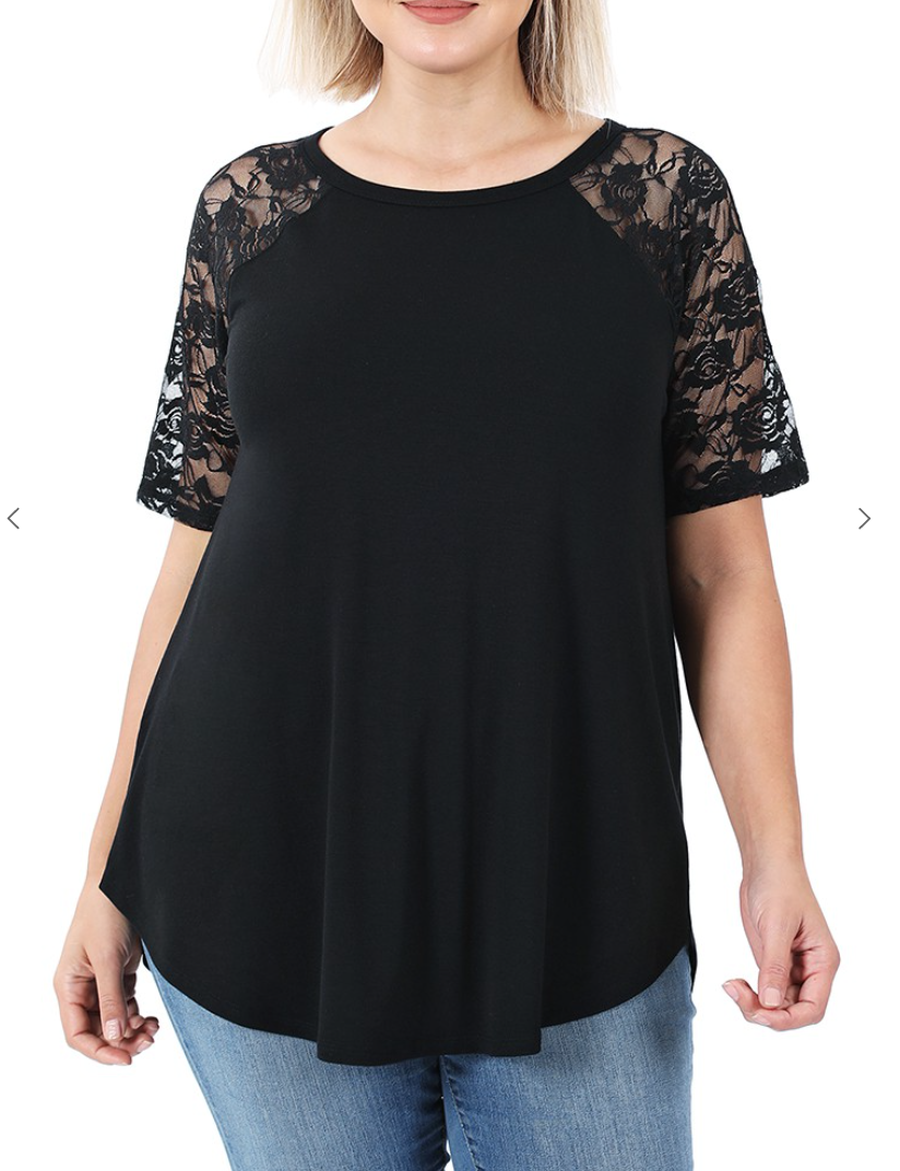 PLUS LACE DETAIL SHORT SLEEVE ROUND NECK & HEM TOP
