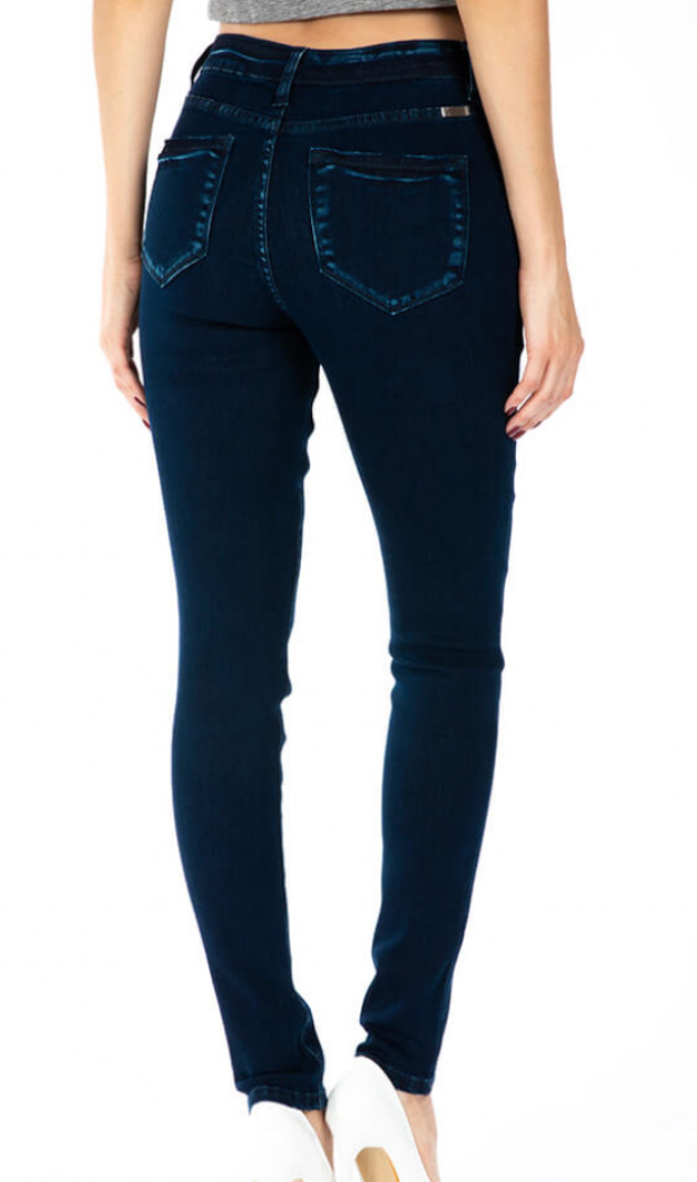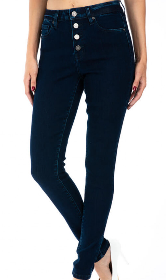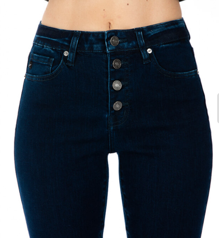 Button fly high waisted jeans with dark denim wash. True to KanCan sizing. No distressing, slight faded wash on back pockets. 30.5inch inseam, 9.5inch rise.