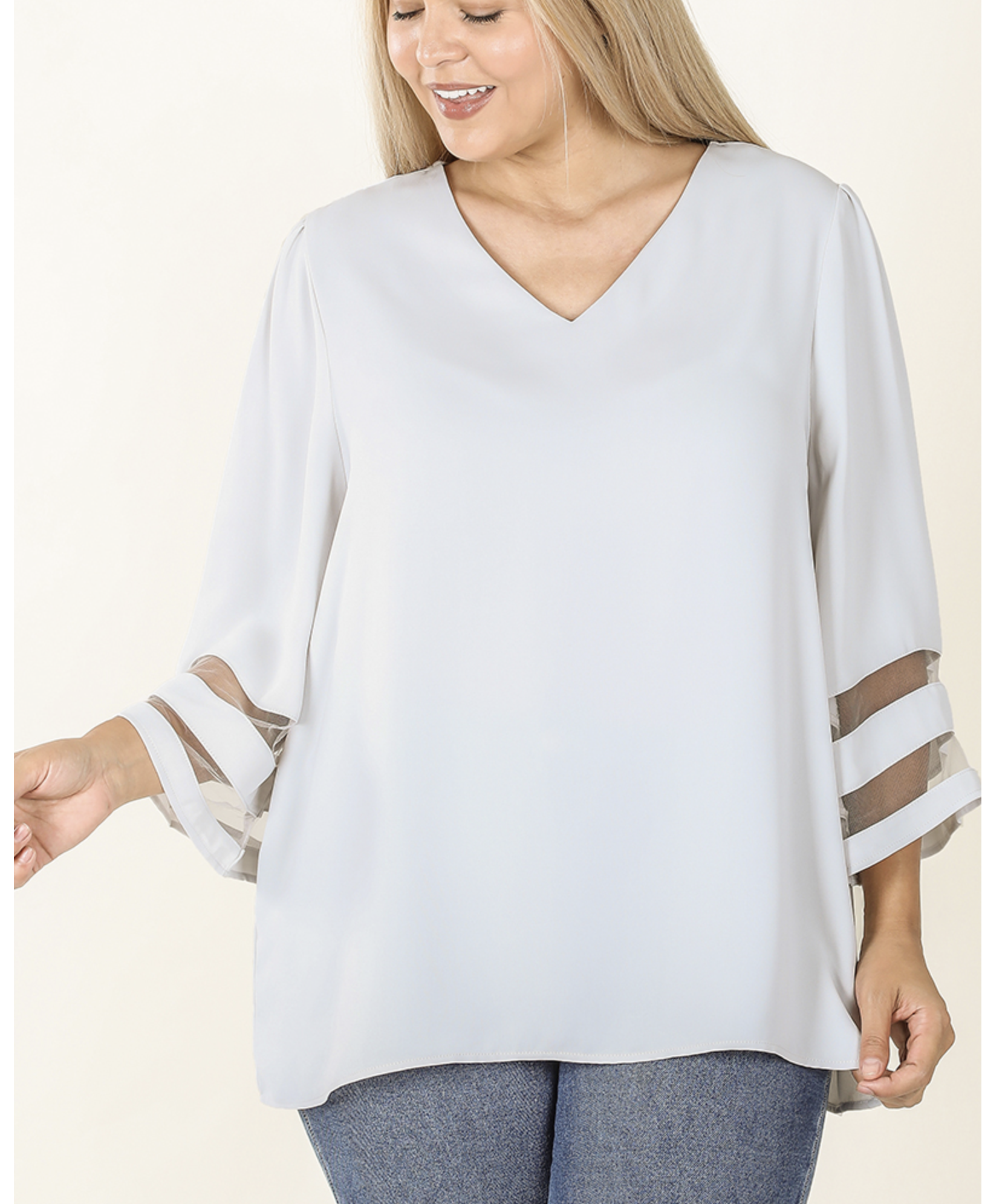 PLUS WOVEN WOOL PEACH MESH PANEL 3/4 BELL SLEEVE TOP