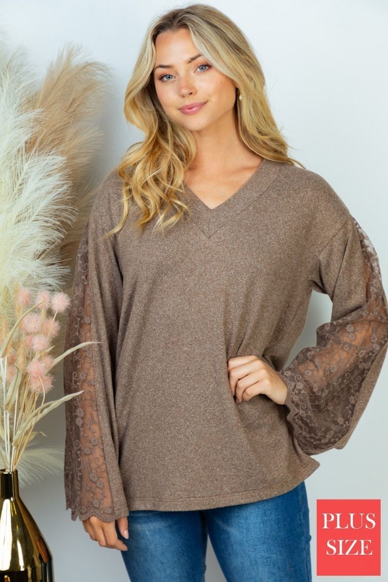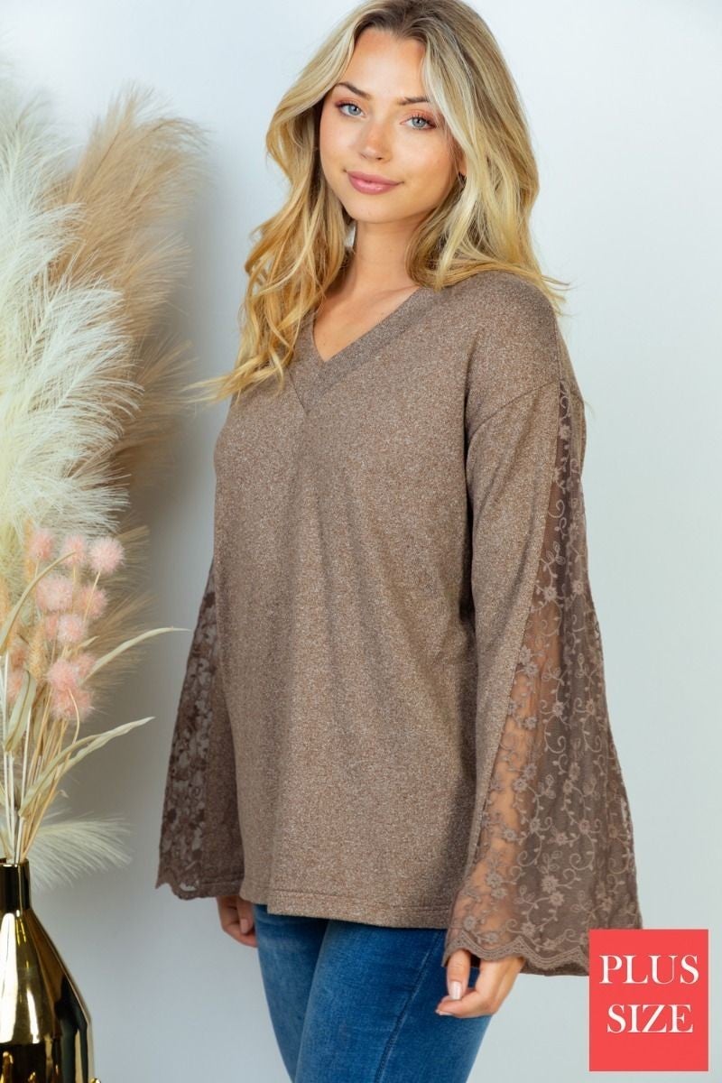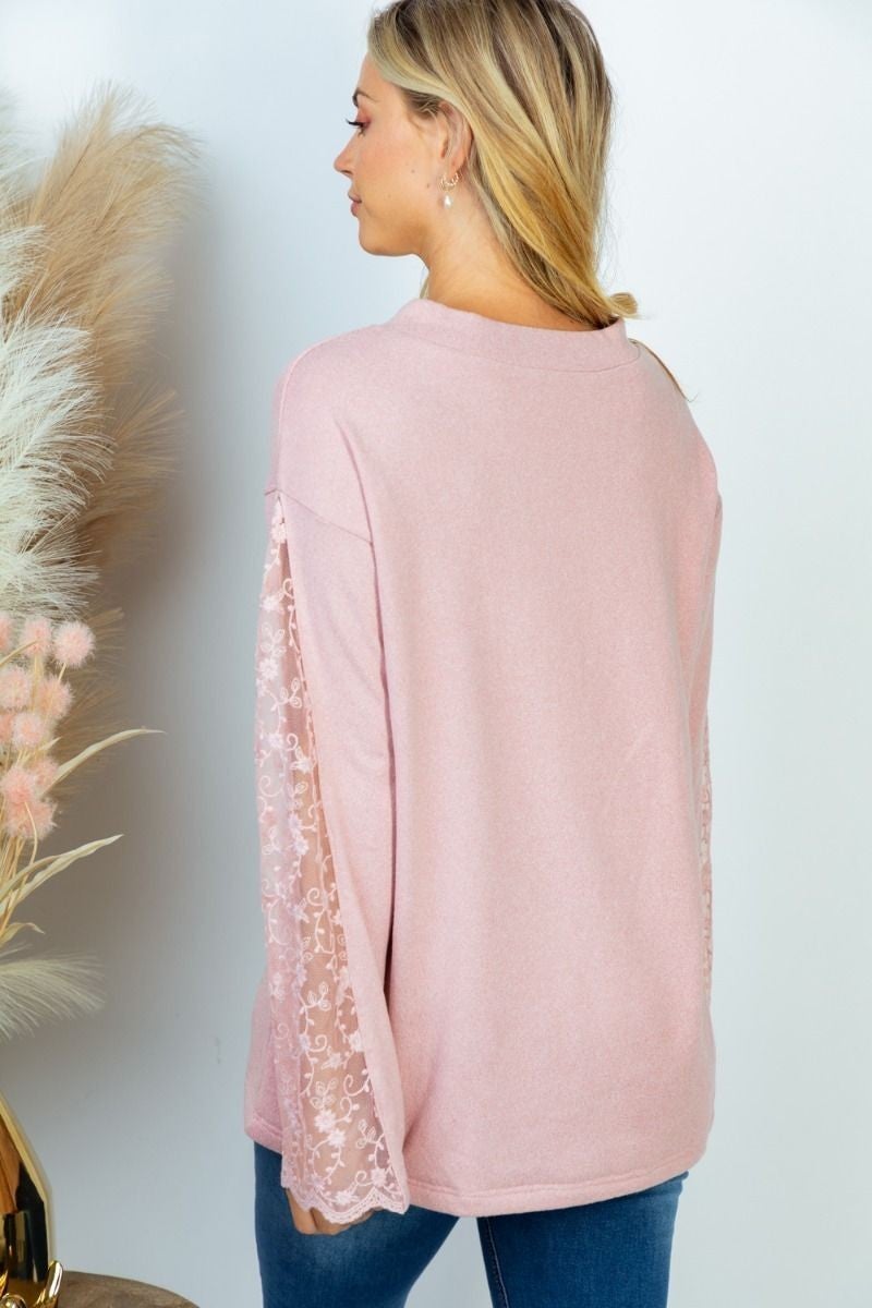 White Birch high-quality lightweight knit top with lace sleeve detail. Relaxed fit!